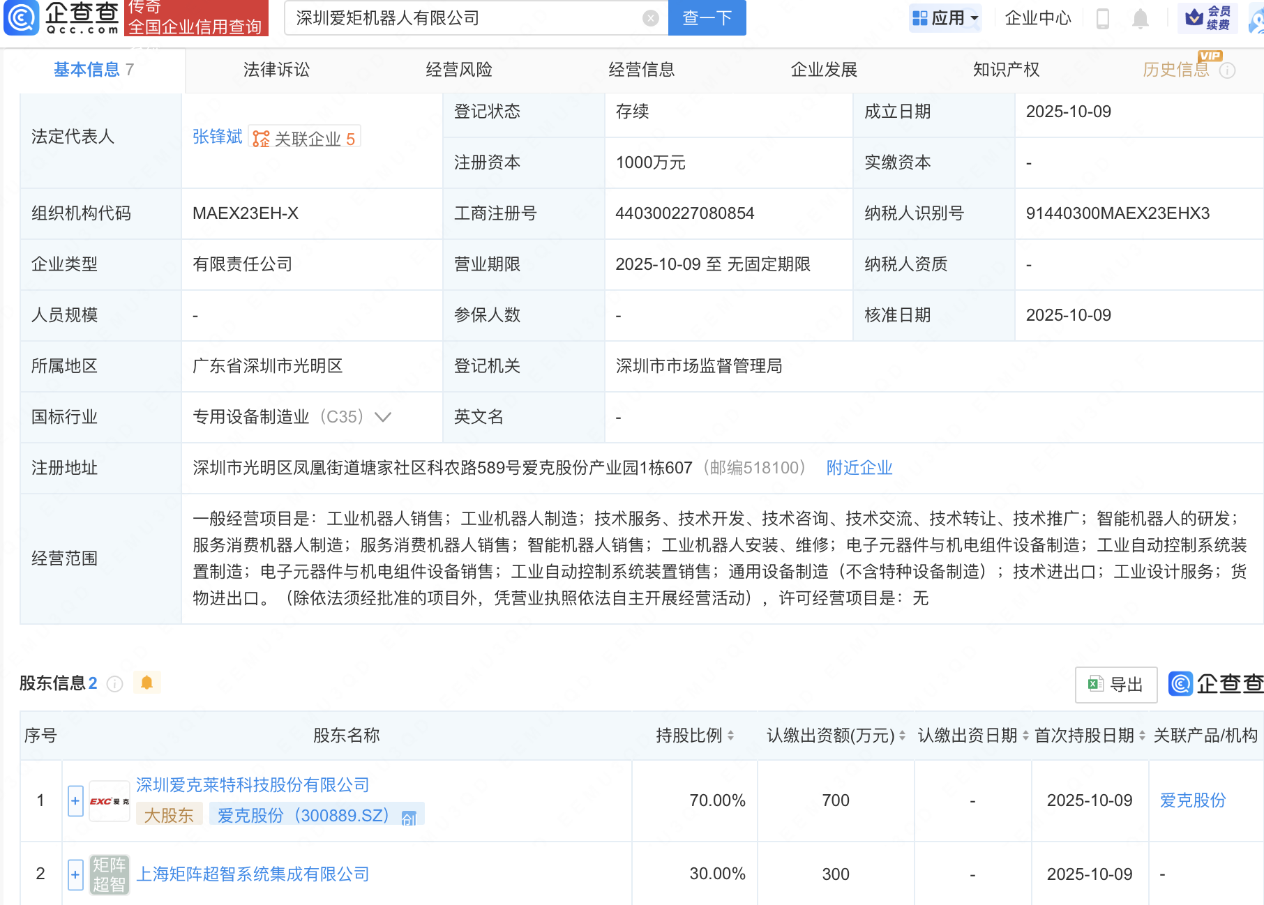 近日,深圳爱矩机器人有限公司成立,注册资本1000万元,经营范围包含:智能机器人的研发;服务消费机器人制造;服务消费机器人销售;智能机器人销售等。企查查股权穿透显示,该公司由爱克股份(300889)等共同持股。